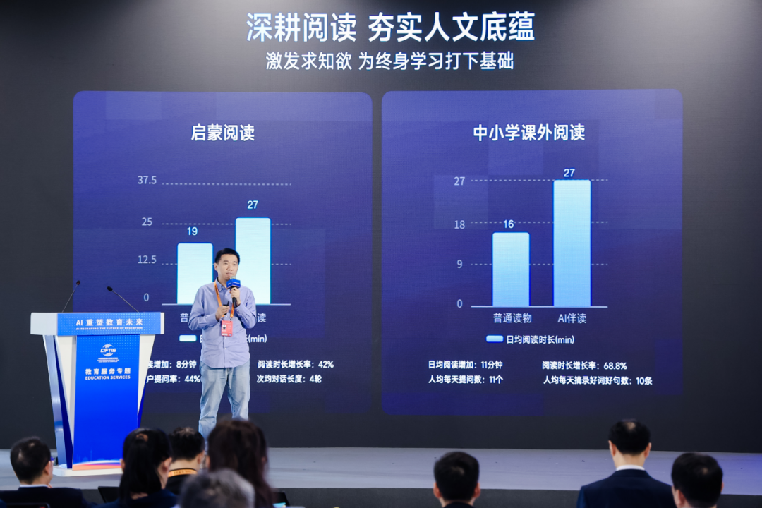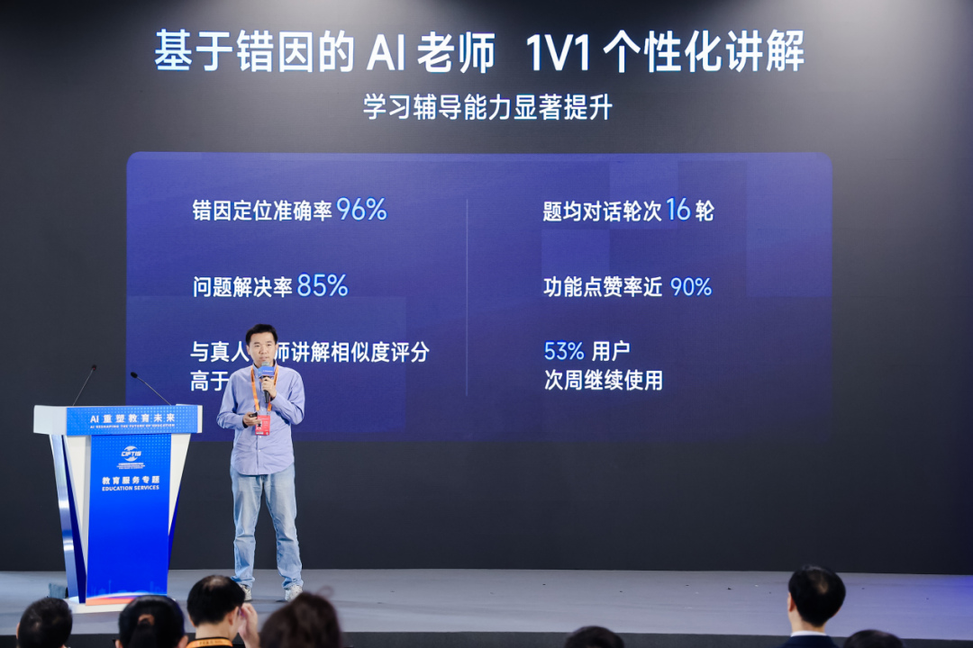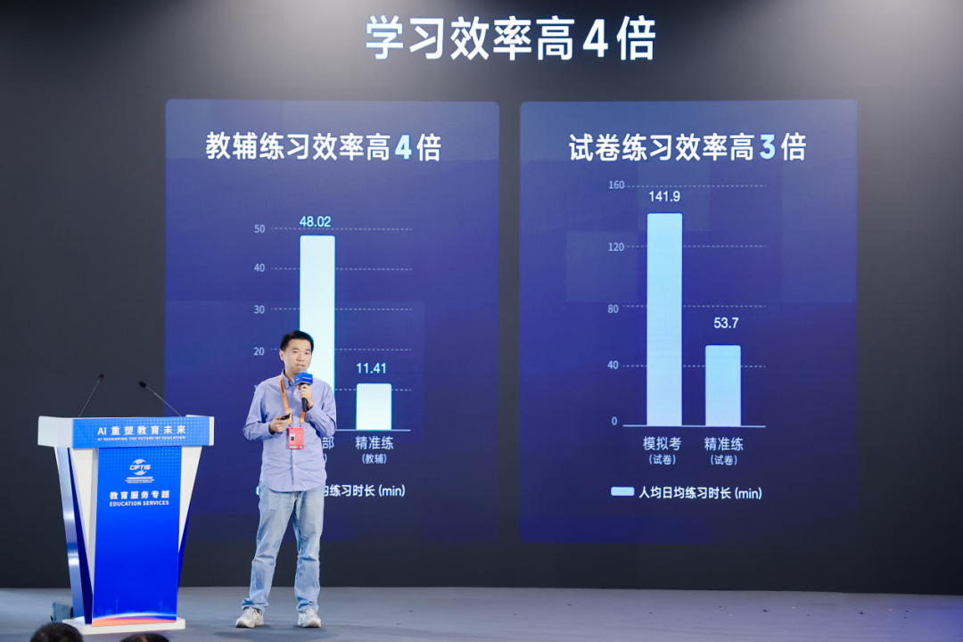 会上,王向东分享了实证成果——教辅练习效率提升4倍,试卷练习效率提升3倍:传统教辅练习模式下,孩子每天平均需练习48分钟,而小猿 AI “精准练” 模式下,同等效果练习仅需约 11.4 分钟;传统备考中,学生日均试卷练习需 141.9 分钟,“精准练” 模式下则缩减至 53.7 分钟。节省的时间为学生探索兴趣、涵养素养创造了条件,契合复合型人才培育需求。