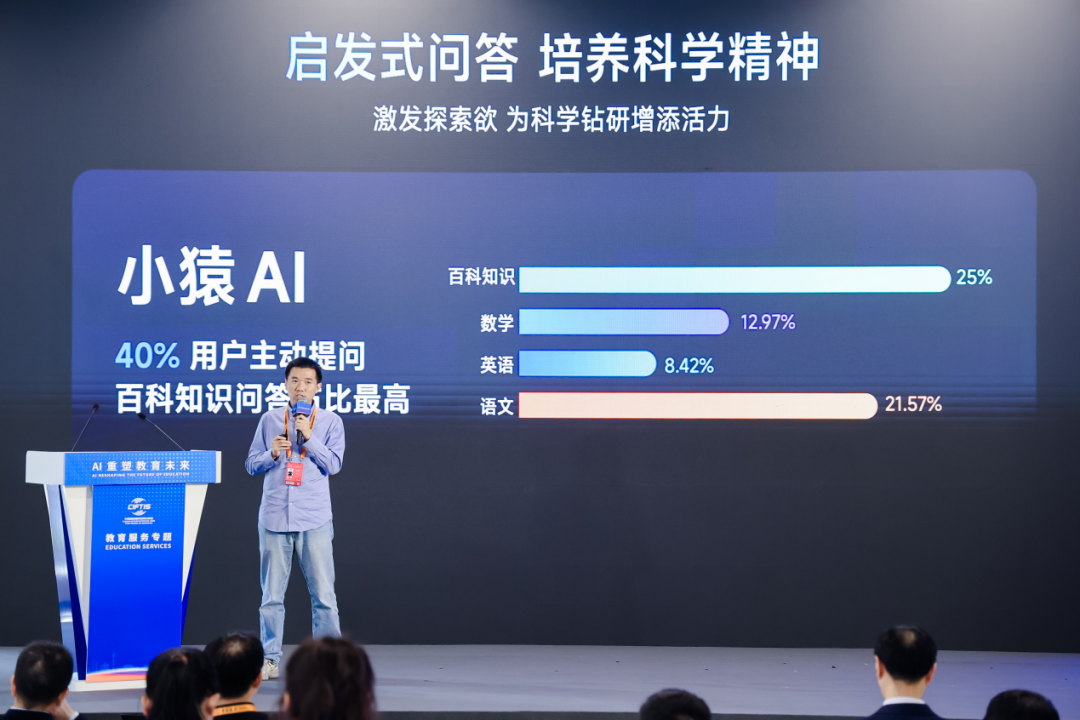 启发式问答则成为提升孩子科学精神的重要抓手。王向东展示的数据显示:“40% 的用户会主动向小猿AI提问,其中百科知识问答占比最高,达 25%,远超学科问题占比。“小猿AI 不会只给答案,还会引导孩子观察生活、查阅相关资料,这种‘探索式学习’正是科学精神的起点。”