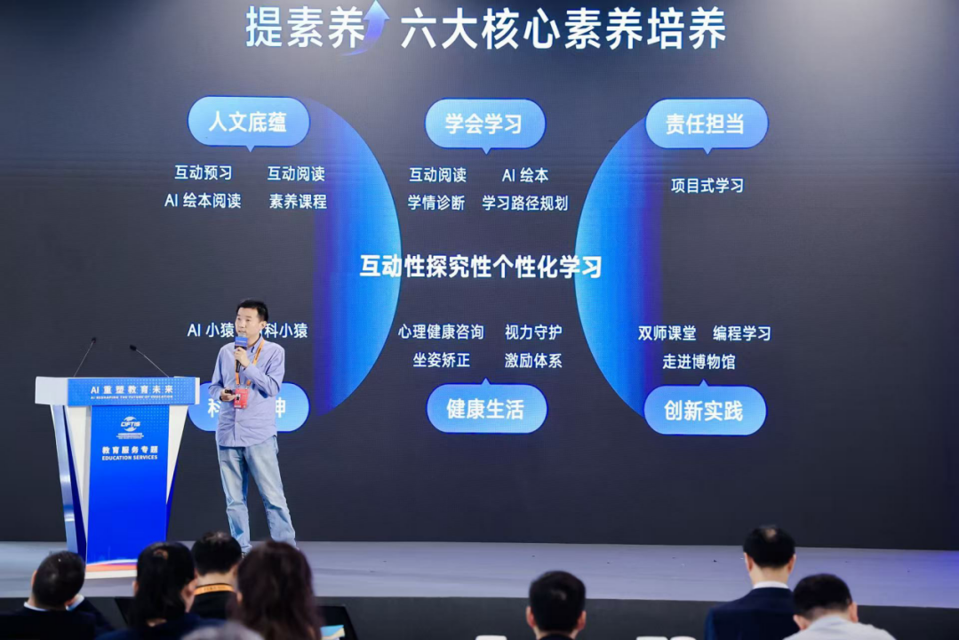 在提质层面,小猿AI推动 “教育精准化革命”。其全场景个性化学习体系兼具全学科覆盖的 “广度” 与近真人辅导的 “深度”:目前 “全学科、全题型 AI 自动批改” 覆盖度已接近 100%,可以高效保障批改质量;“基于错因的 AI 1V1 讲解” 功能,摒弃 “一刀切” 的机械灌输,采用 “哪里不会讲哪里” 的个性化策略。据悉,该功能错因定位准确率高达96%,用户问题解决率达85%;一线老师调研显示,其讲解与真人老师相似度评分超90分;后台数据进一步显示,近 90% 用户对该功能点赞,53% 用户次周仍会主动使用。这种精准辅导如同 “认知修复工具”,帮助学生攻克薄弱点与难点,筑牢学习基础。 聚焦核心素养:从知识学习到全面成长 小猿AI将服务进一步延伸至 “提素养” 领域,围绕六大核心素养打造应用场景,潜移默化地培养孩子的人文底蕴、科学精神,助力孩子学会学习、健康生活,甚至学会责任担当——这也是王向东在演讲中着重强调的 “教育AI更高阶的价值”。
