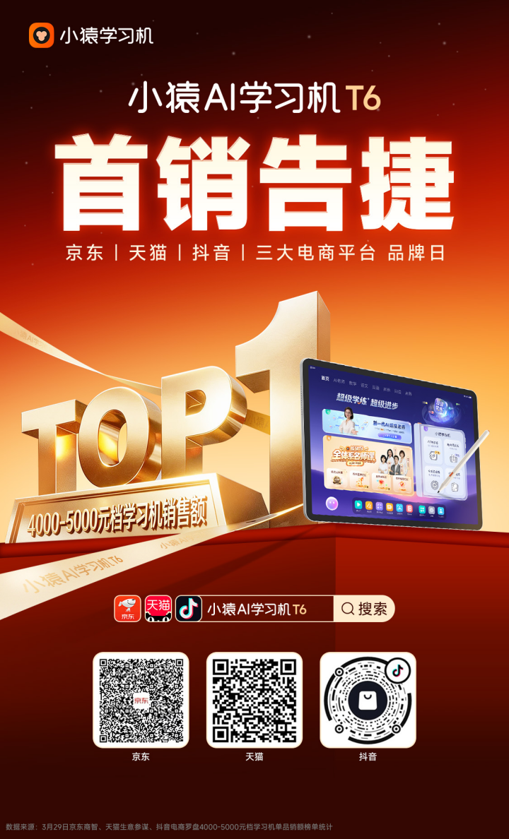 小猿AI学习机T6首销告捷,荣登三大电商平台4000-5000元档学习机销售额榜首3月29日,刚刚发布的小猿AI学习机T6迎来品牌日,凭借强劲的市场表现一举斩获京东、天猫、抖音三大主流电商平台4000-5000元档学习机销售额第一名,成为该价格段内最受消费者青睐的学习机产品。这一成绩不仅彰显了T6学习机强大的产品力,也进一步印证了市场对AI赋能学习效果提升的普遍认可。 作为搭载行业首个“超级学练智能体”的学习机,小猿AI学习机T6的脱颖而出并非偶然。这一智能体秉承“以终为始”的理念,以“掌握度模型”为牵引,重构了“诊-学-练-测”学习全流程,真正让学习效果变得可见、可衡量。在T6学习机上,孩子进入“超级学练”,系统会自动规划从诊断到学习、从练习到测试的完整学习路径。每节课程结束后都有自动推送的针对性练习,每次练习后会实时更新“掌握度”,而最新的掌握度数值又会驱动下一阶段的学习规划。这种“学-练-评”的动态循环,不仅让知识点的掌握情况与变化趋势一目了然,更让T6越用越懂孩子、越用越有效。 正是基于这一核心功能优势的扎实打磨,小猿AI学习机T6在上市之初便赢得了市场的热烈反响。据电商平台官方数据显示,在品牌日当天,小猿AI学习机T6在京东、天猫、抖音三大主流电商平台4000-5000元档学习机单品销售额榜单中均位列榜首,用户好评率高达100%。 业内人士认为,T6在学习机中高端价格带的出色表现,反映出消费者对“效果驱动型”教育产品的价值认可,越来越多的家庭愿意为能够真正带来学习效果提升的教育AI产品进行合理投入。这背后也印证了小猿“教育+AI”技术路线的正确性——依托自研的猿力大模型以及多年积累的海量学习数据和学练资源,将AI技术与真实家庭教育场景深度融合,推出真正解决用户痛点的产品,而非流于表面的科技噱头。 随着AI技术在教育领域的持续深入,小猿AI学习机T6的首销告捷只是一个开始。这款产品所搭载的“超级学练智能体”,其技术积累与创新实践已从企业探索走向行业共识——3月中国信通院发布的《智能体技术要求与评估方法行业应用智能学练》(团体标准),由小猿牵头制定。猿力科技集团副总裁王向东表示,“小猿将继续聚焦用户需求,以技术创新驱动产品迭代,让高效的智慧学习真正惠及每一个家庭,推动教育公平与质量的双重跃升。”