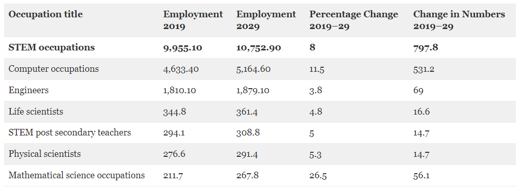 根据上述估计,在未来十年,STEM 职业的增长比例将远远高于非 STEM 职业,以下是 STEM 职业中的细分职业的进一步发展预测。