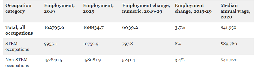 ![]() 注:人数以千为单位。科学、技术、工程和数学(STEM)职业包括计算机和数学、建筑和工程、生命和物理科学职业,以及与这些职能领域相关的管理和中学后教学职业和需要中学后科学或技术知识的销售职业。